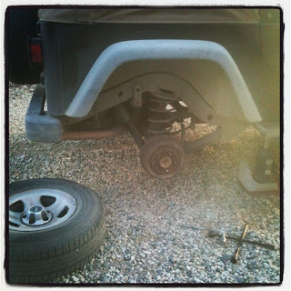 Well I went out to my jeep to grab some dinner tonight and noticed that my back tire is going flat. I first considered trying to try to drive to the local gas station to fill it up, temperately. As I don't have much luck when changing tires. But I know it's bad to drive on a flat and I can see the nail sticking out of the tire so I opted to change it. Now at this time I don't know if my spare if good or not. I've had so many flat tired in the past year I can't remember... but I take a chance.